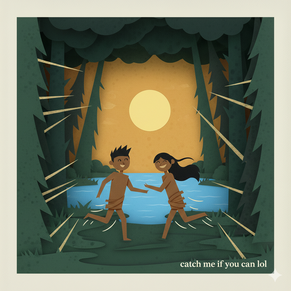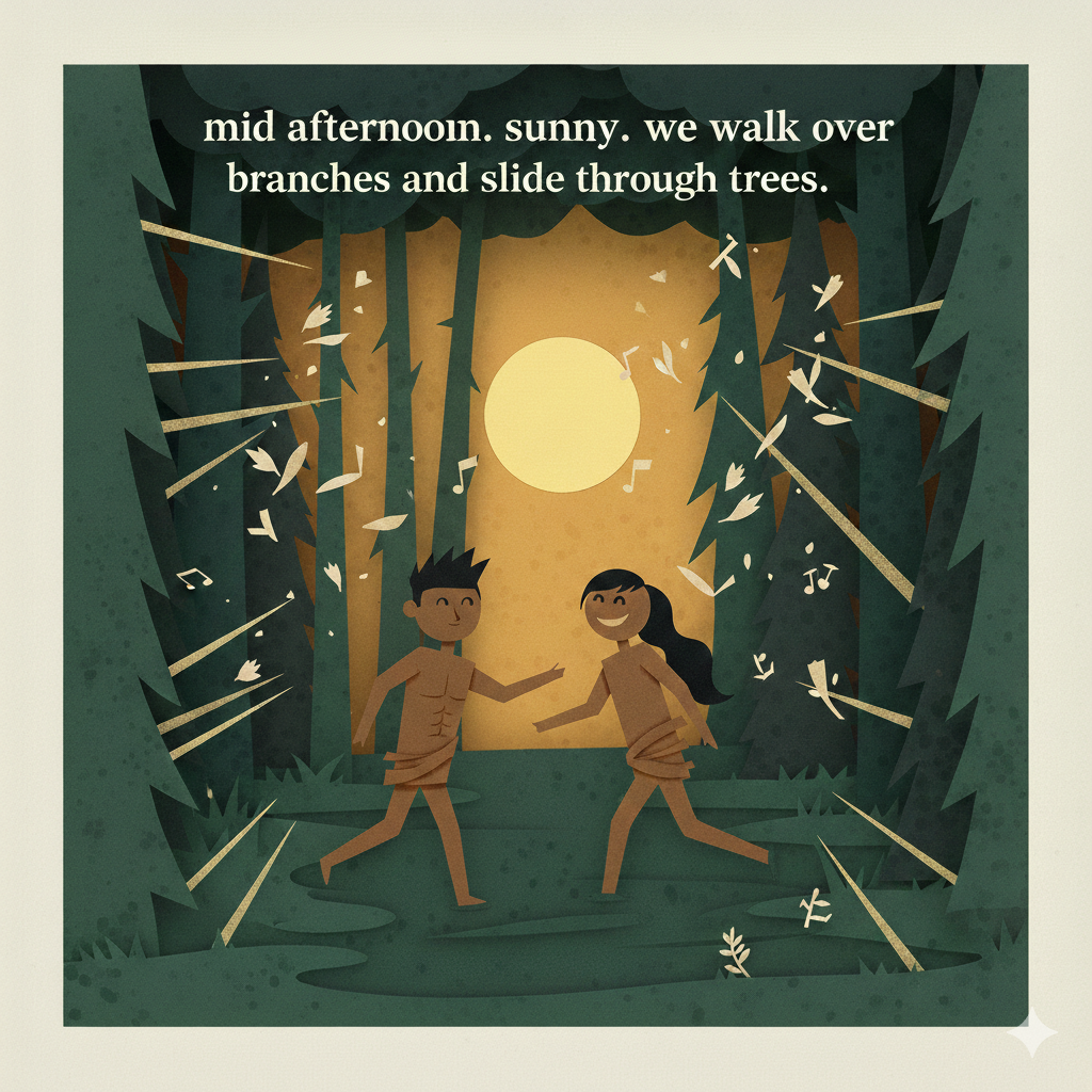 mid afternoon. sunny. we walk over branches and slide through trees.